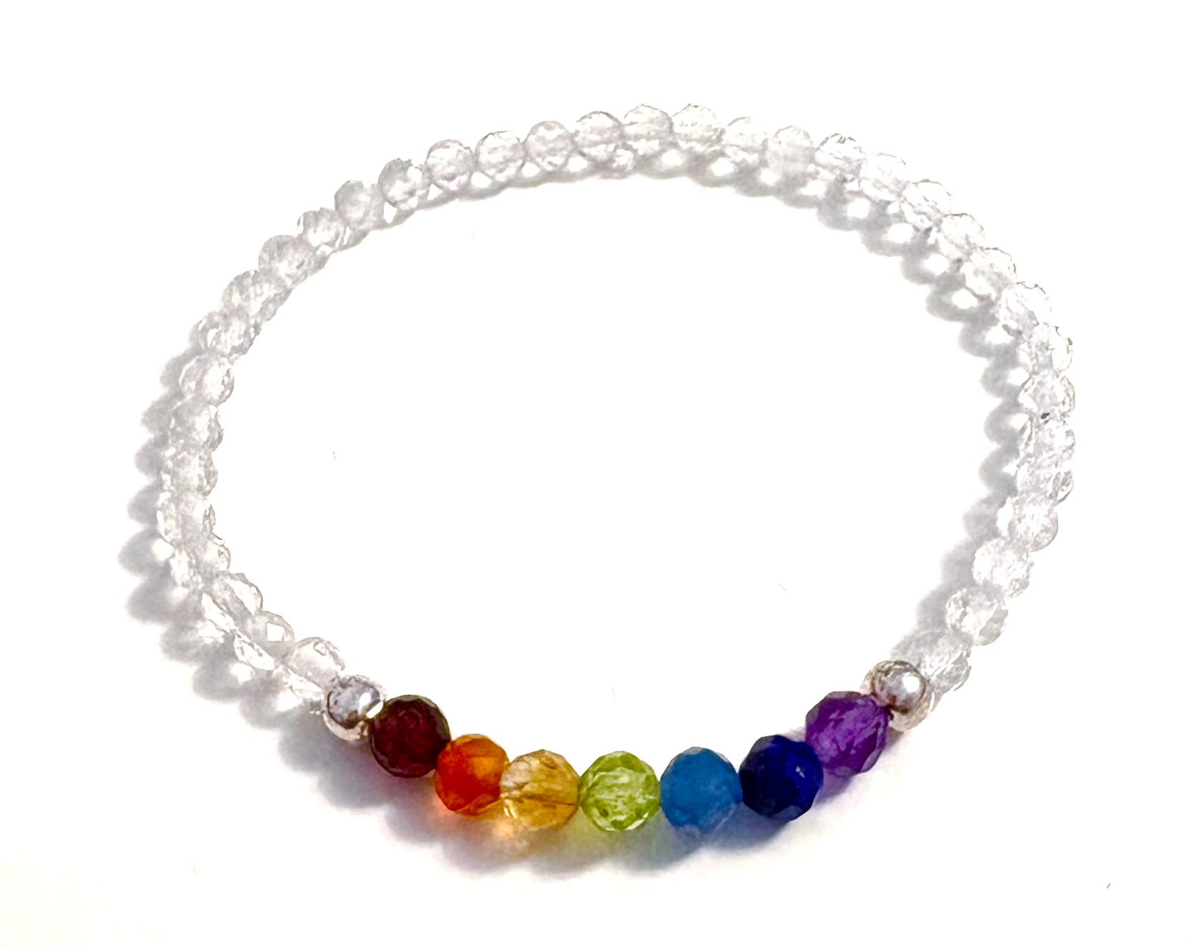 Bergkristall Kinderarmband, Chakrasteine, facettiert, auf Elastikband
