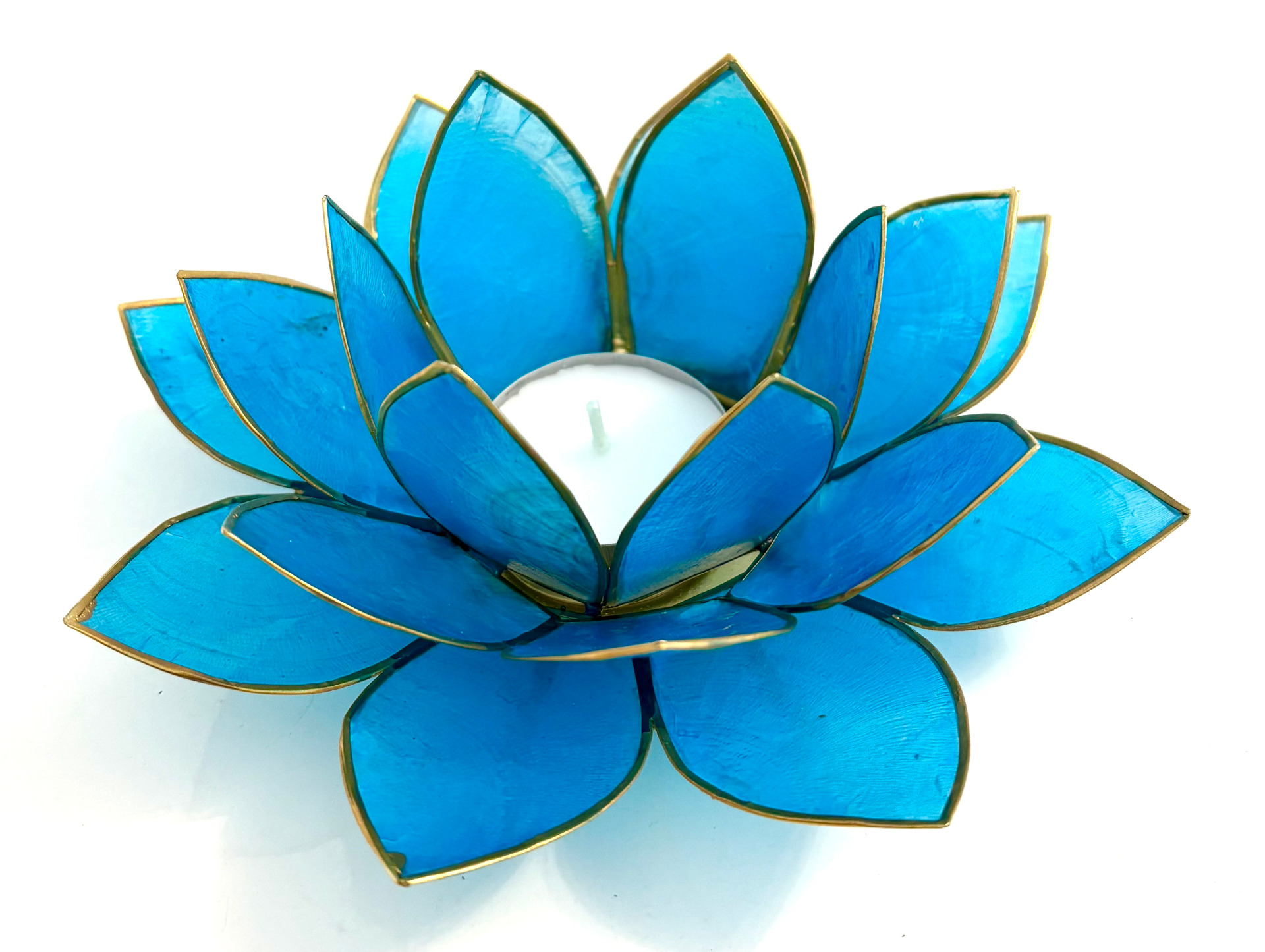 Lotus Kerzenhalter, hellblau, mit goldfarbenem Rand