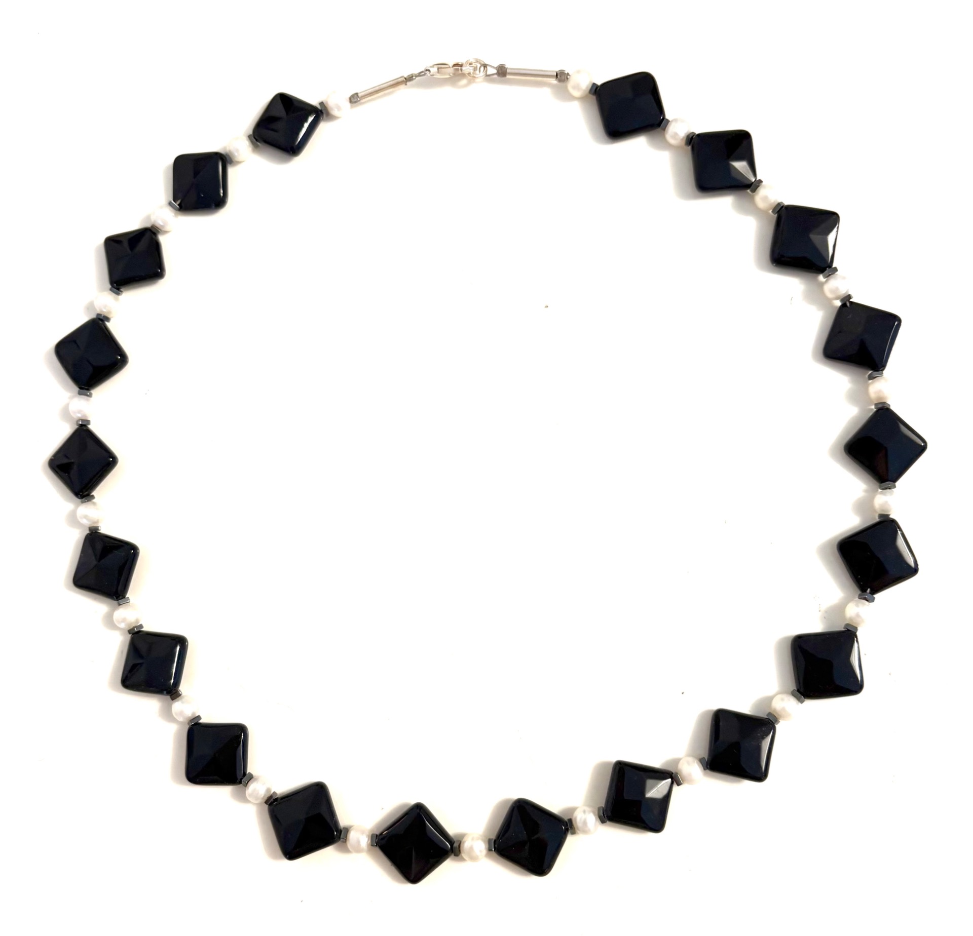 Onyx Kette mit Perlen, mit Karabiner-Schließe