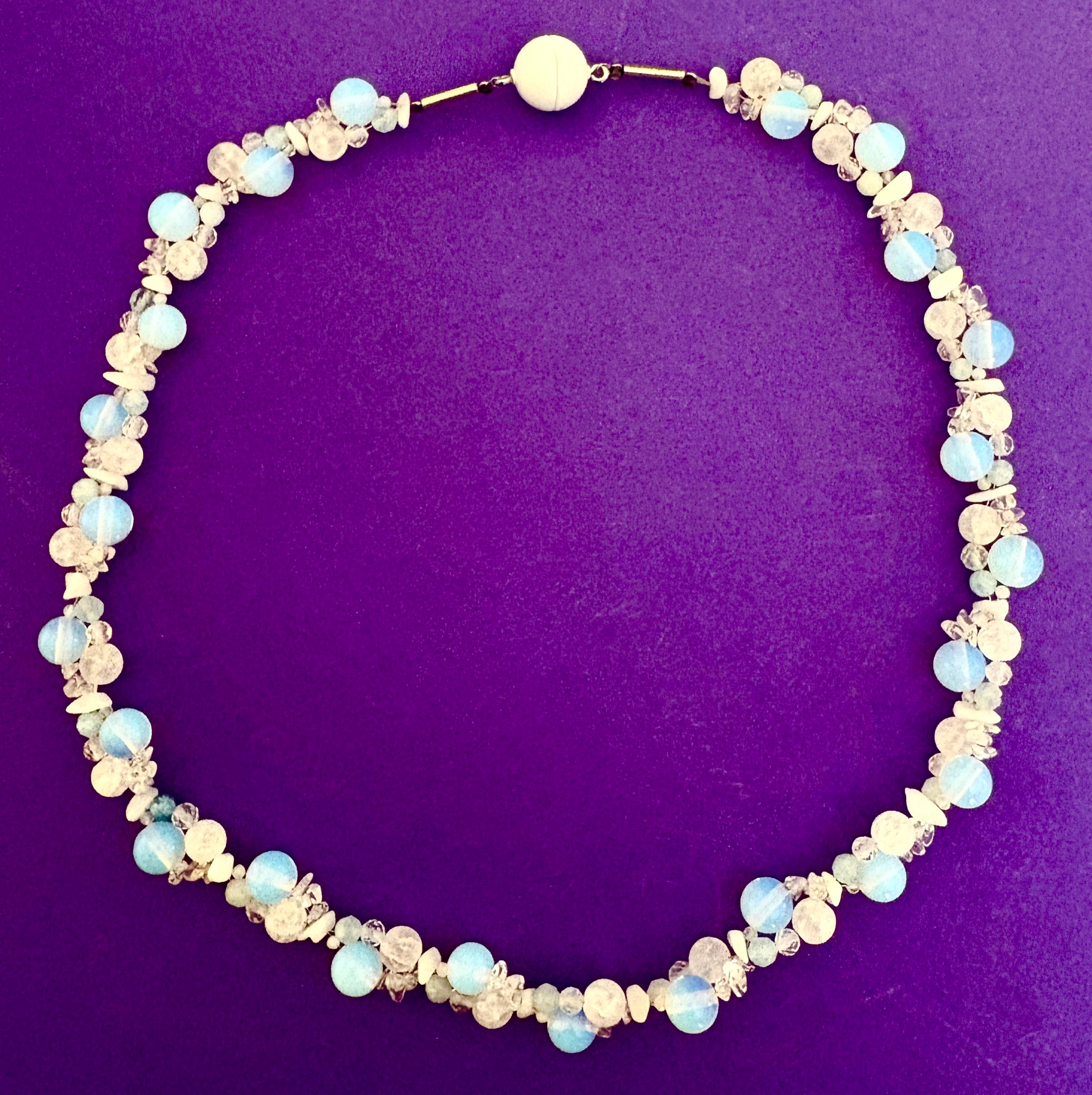 Opalit-Kette mit Aquamarin, Bergkristall und Mondstein, Kugel-Magnetschließe