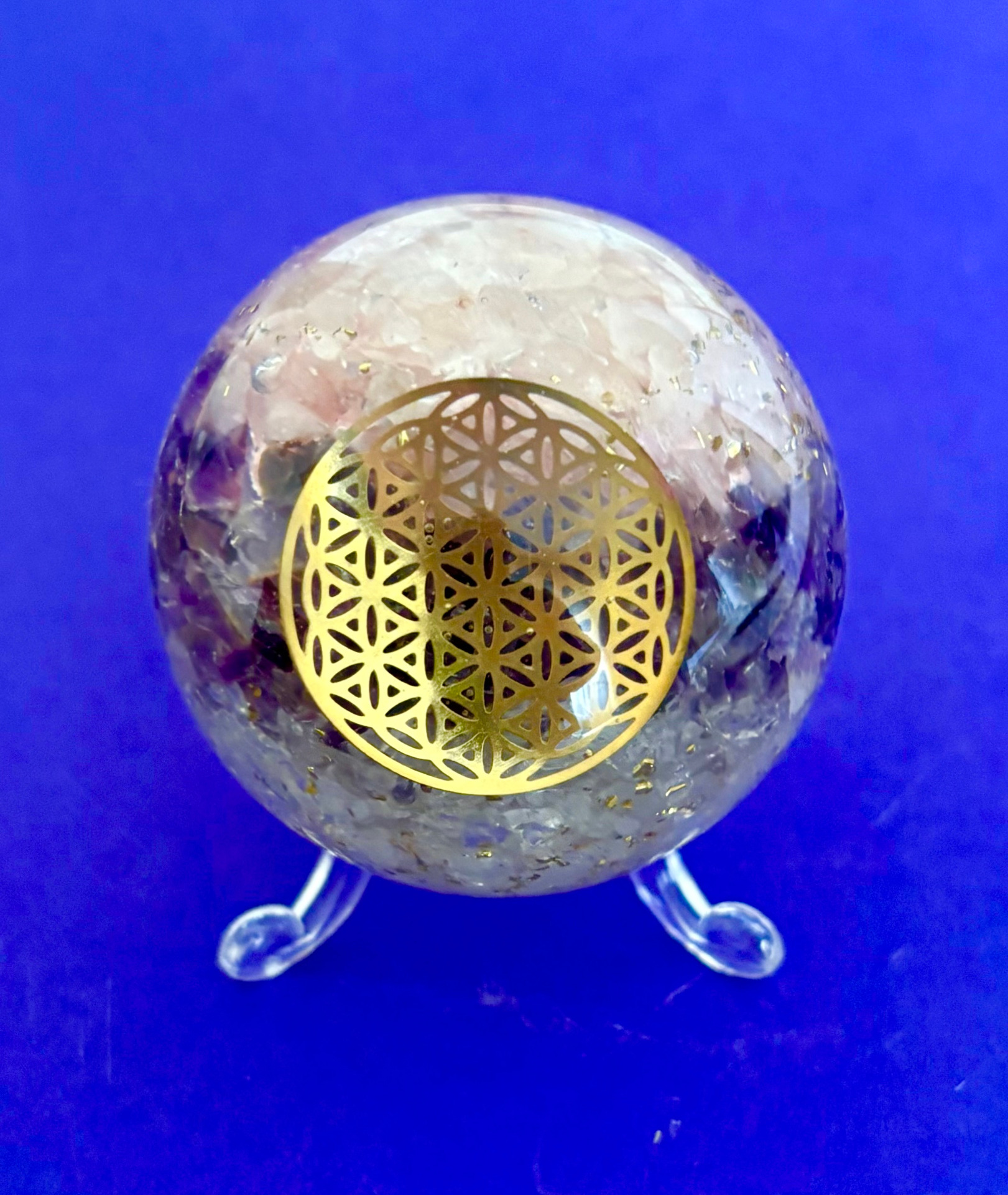 Orgonit Kugel Goldenes Dreieck: Amethyst, Bergkristall, Rosenquarz; Lebensblume