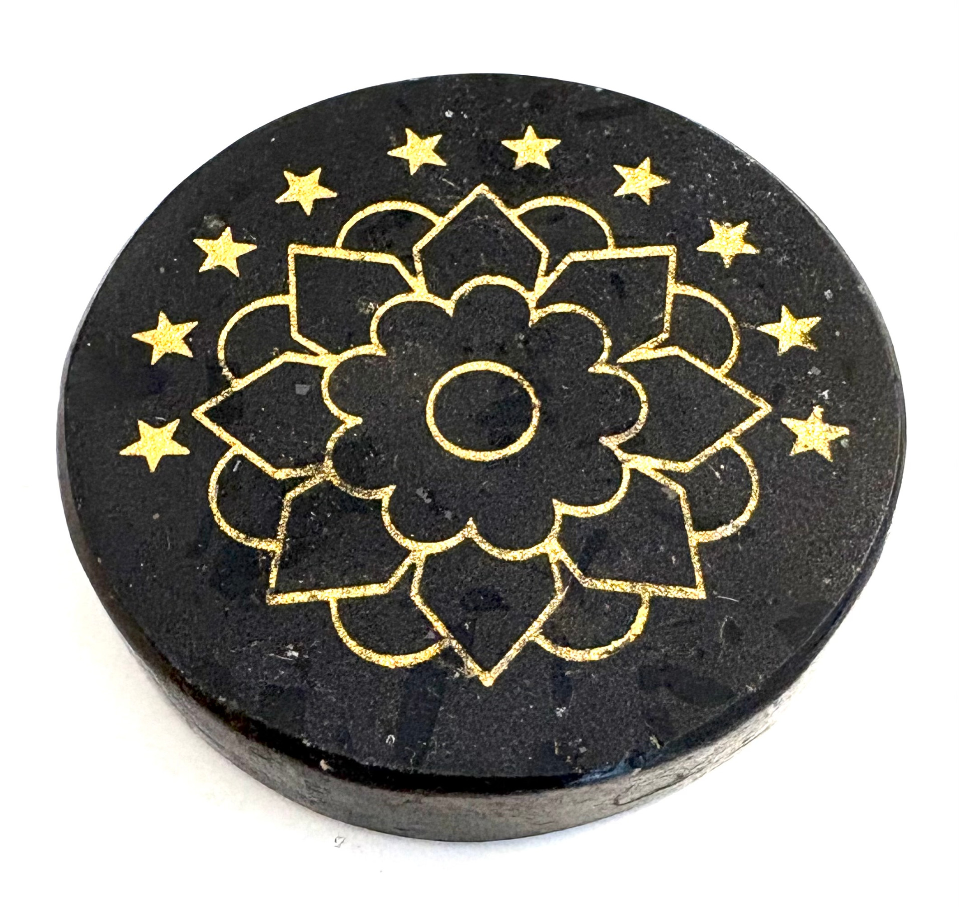 Turmalin Scheibe, schwarz, Lotus, goldene Gravur